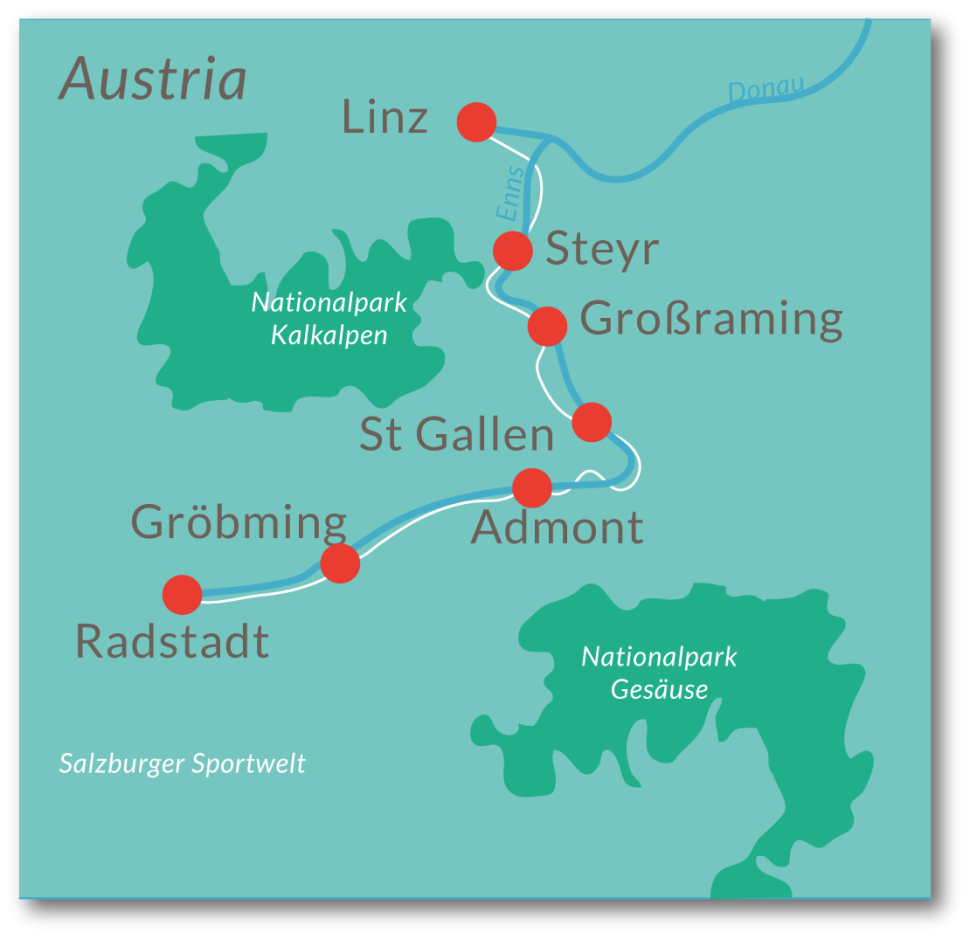 Flusstal und geschichtsträchtig: Früher wurde hier Eisen auf Flößen transportiert, heute radeln Sie entspannt durch diese traditionsreiche Region. In Steyr mündet die Steyr in die Enns – und Kulturliebhaber kommen voll auf ihre Kosten: historische Altstadt, Burghäuser,