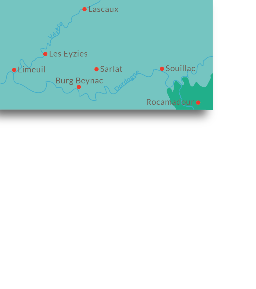Salignac geht die Radtour durch liebliche Landschaft bis zu einer Nussölfarm. Weiterfahrt nach einem informativen und kulinarischen Stopp bis zur eindrucksvollen Abteikirche von St-Amand-de-Coly. Von dort geht es weiter bis nach Lascaux auf einer wunderschönen Radstrecke. Besichtigung von Lascaux IV und seine unglaublichen Malereien, bevor es an der Vézère entlang geht bis zum Roque Saint Christophe. Auf 5 Terrassen siedelten hier vor 50.000 Jahren bereits die ersten Menschen. Ausführliche Besichtigung der auf 50 m Höhe gelegenen „Abri“ und selbstverständlich darf der Fotoapparat nicht fehlen.