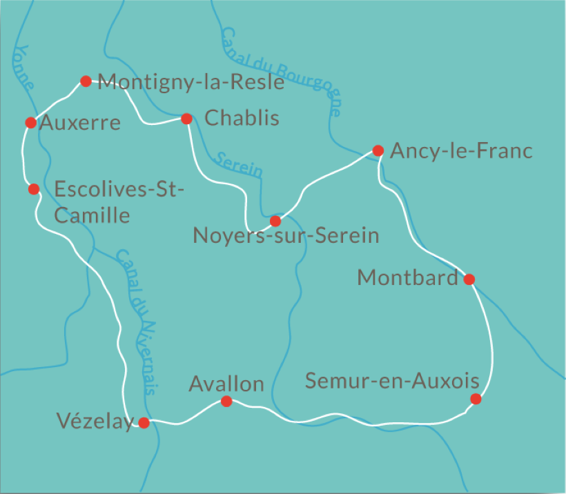 Bei Escolives überqueren Sie die Yonne und den Canal du Nivernais zu einem Abstecher zu den schönen Winzerdöfern der Côtes d’Auxerre. Eine Probe des Crémant de Bourgogne steht noch auf dem Programm, bevor Sie wieder an den Canal du Nivernais zurückkehren. Weiterfahrt an den Ufern der Yonne bis nach Auxerre.