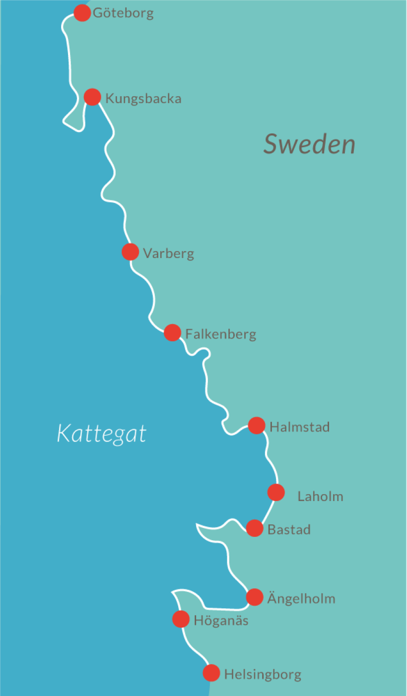 Die Kattegattleden-Route von Ängelholm führt entlang der Küste und dann landeinwärts durch die Halbinsel Bjäre, mit einem sanften Anstieg, der allmählich steiler wird, und durch moderne und historische Agrarlandschaften. Die Route endet in Båstad, von wo aus Radfahrer mit dem Zug nach Halmstad fahren können (insgesamt 60 km oder 41 km mit einer Abkürzung). Alternativ beträgt die gesamte Strecke nach Halmstad ohne Zug 94 km (oder 76 km mit einer Abkürzung). Nach Båstad folgt die Route einem langen Sandstrand, bevor sie landeinwärts durch Naturschutzgebiete in Richtung Halmstad Stadtzentrum führt. Die Zugfahrt kostet für einen Erwachsenen mit Fahrrad etwa 10 bis 20 Euro, wobei regelmäßige Verbindungen und Fahrradstellplätze je nach Verfügbarkeit angeboten werden.