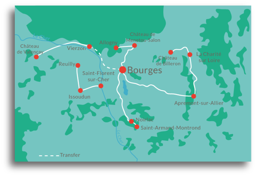 Notre première journée à vélo nous mène au château de Menetou. Construit au XIIe siècle par Jacques Cœur, grand financier du roi Charles VII, il a été remanié au XIXe siècle dans un style néo-gothique. Son parc de 800 hectares et son mobilier intérieur de grande qualité méritent le détour. Après avoir passé la matinée à pédaler à travers les champs de maïs, nous atteignons maintenant la région densément boisée du Berry, avec ses fougères et ses forêts épaisses. Après une halte au menhir de Pierre Pointue et un voyage dans le temps à l’époque mégalithique, nous poursuivons notre randonnée à vélo. Transfert de retour à l’hôtel.